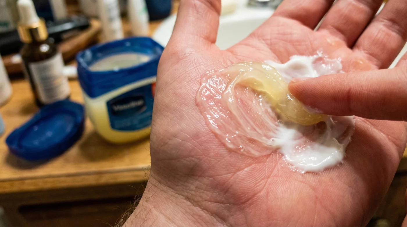- Step 4: Extract exactly 0.5 grams (roughly the size of a small garden pea) of pure Vaseline and vigorously warm it between your fingertips until it visibly melts into a clear, easily spreadable fluid.